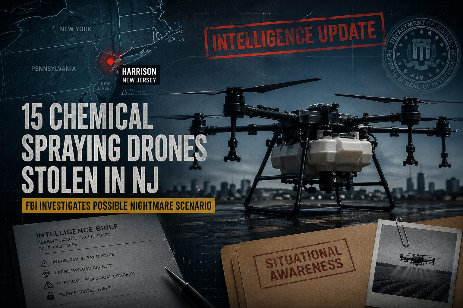 Fifteen Ceres Air C31 agricultural spray drones were reportedly stolen from a logistics company in Harrison, New Jersey, on March 24, 2026, using fraudulent pickup paperwork. The FBI has not publicly confirmed a specific attack plot, but public reporting says investigators are concerned because these industrial spray drones could potentially be used to disperse biological or chemical agents. For Christian households, this is not a reason to panic, but it is a serious preparedness signal involving drone misuse, public events, and local emergency awareness.Assessment